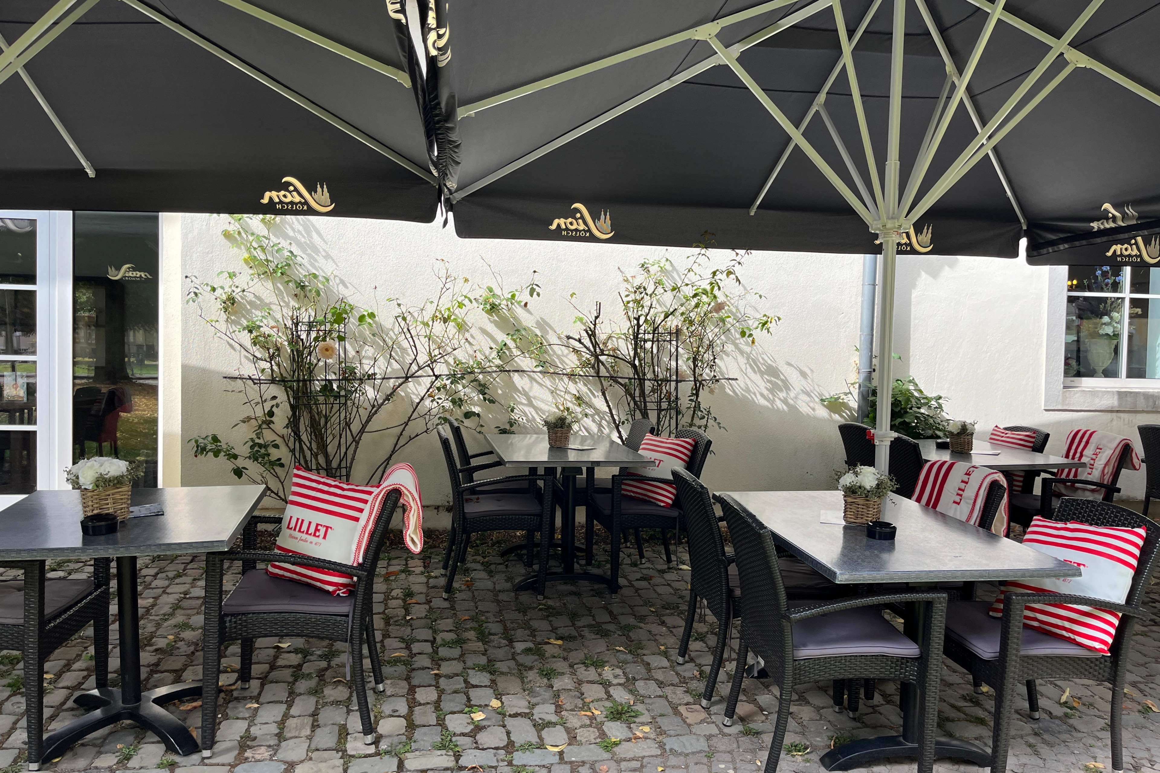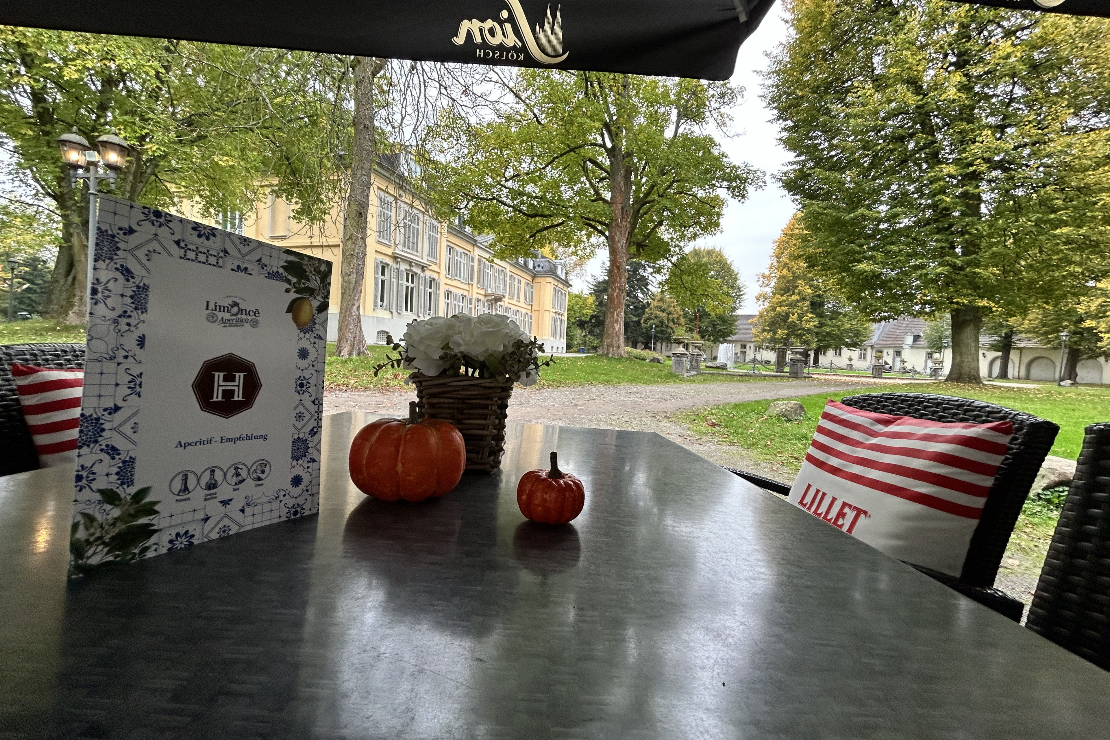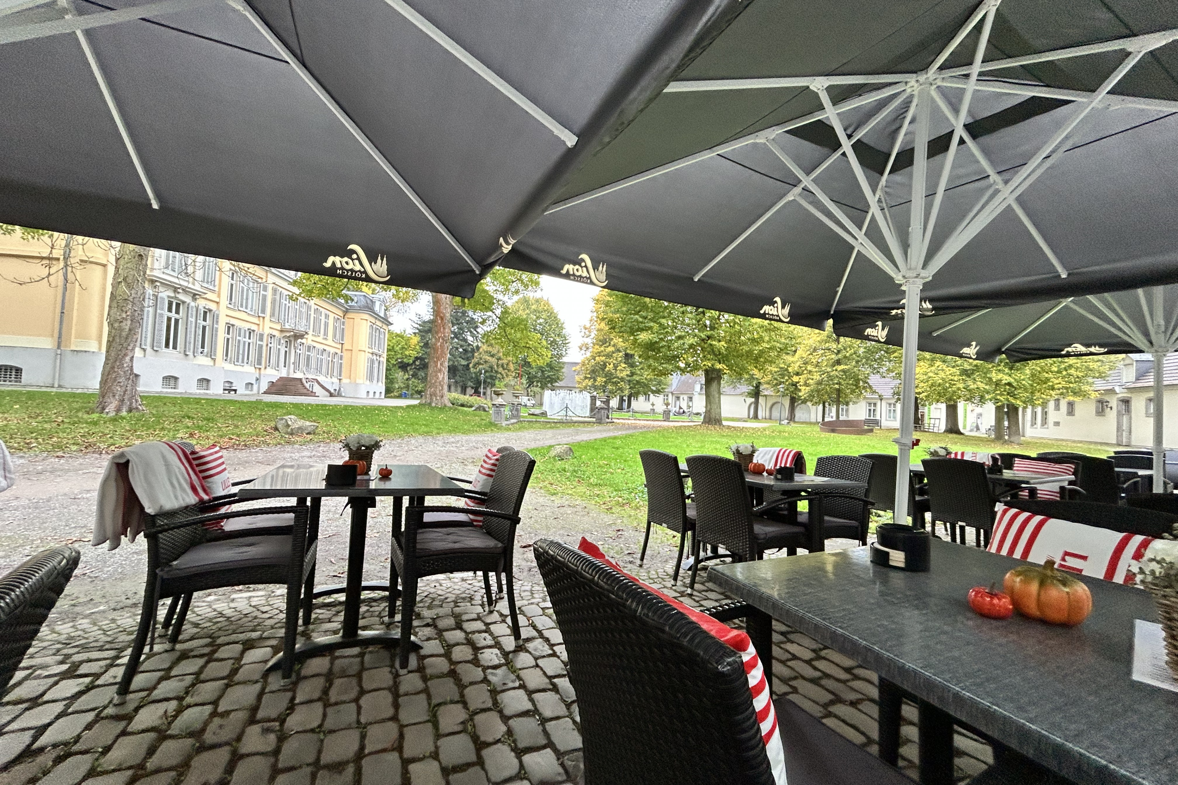 Ihr könnt sowohl im gemütlichen Café sitzen oder bei schönem Wetter draußen Platz nehmen und das wunderschöne Schloss-Enseble genießen.